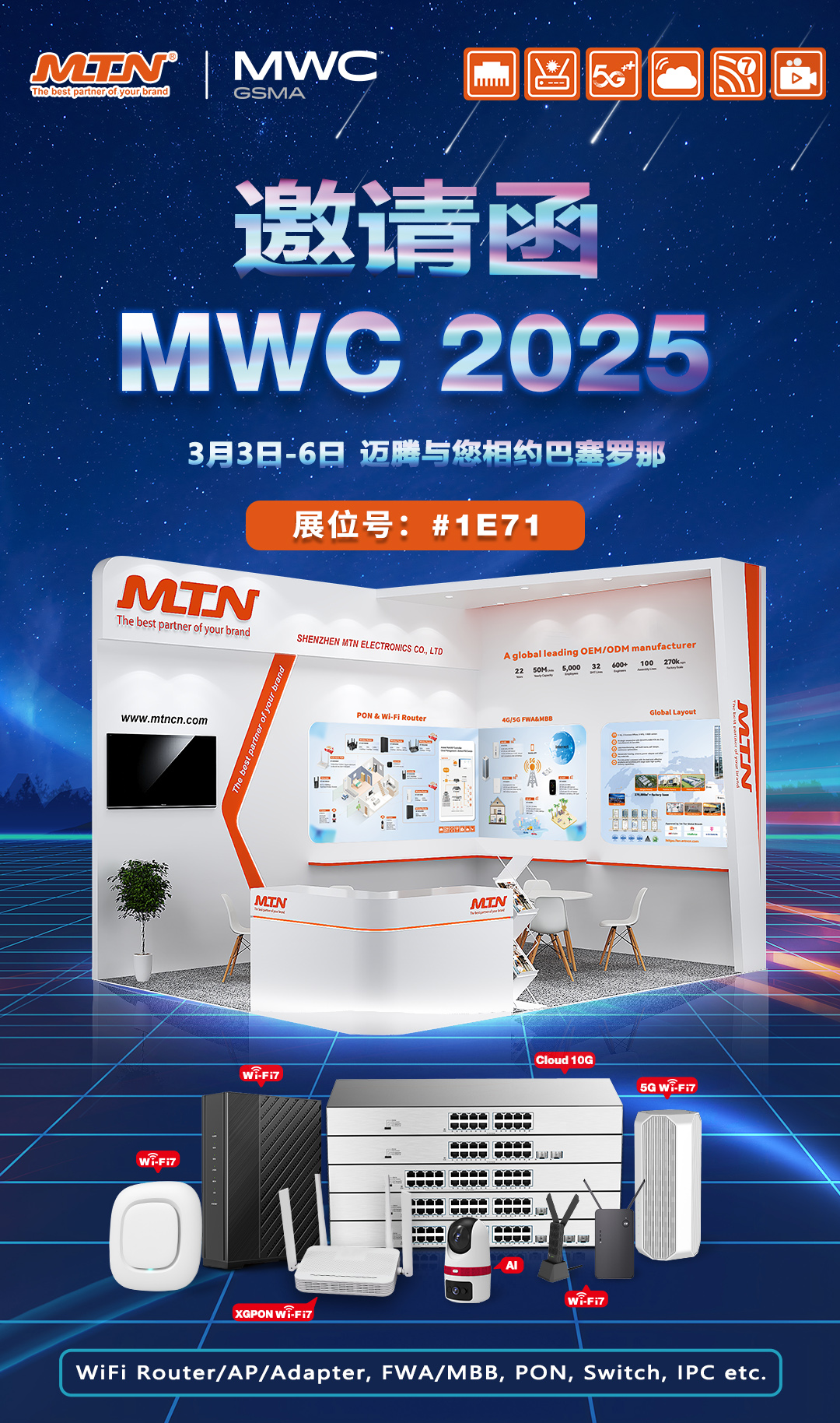 2025年世界移動通信大會(25MWC)盛大啟幕在即,這是一場全球矚目的通信行業(yè)盛會,邁騰電子攜Wi-Fi 7 Router、4G/5G FWA&MBB、AI-IPC等一系列產(chǎn)品和技術亮相。在此,我們誠摯地邀請您蒞臨我們的展位,一同探索通信科技的無限可能!