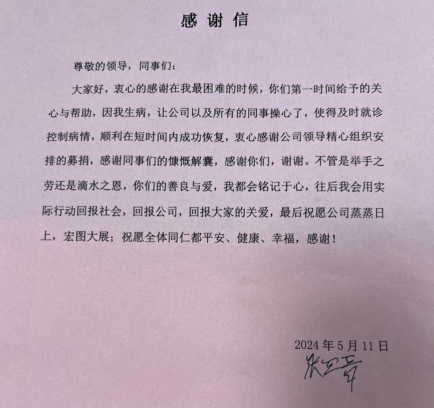 張四晉在收到愛心捐款后,寫下一封感謝信。寫道:“謝謝各位領(lǐng)導(dǎo)和同事在我最困難的送來關(guān)心,向大家表示衷心的感謝,滴水之恩當(dāng)銘記于心?!?/p>
